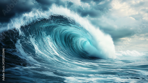 Photorealistic low-angle view of a massive ocean wave cresting under a stormy sky. Ideal for conveying energy, nature's force, and environmental themes.