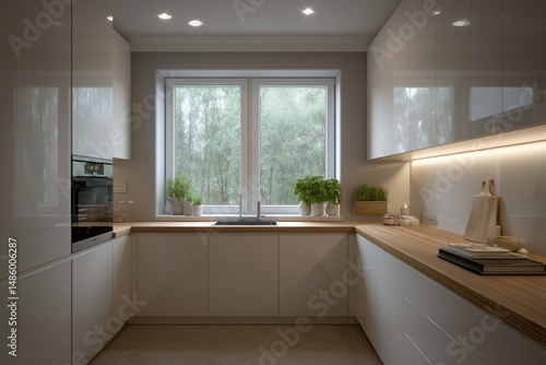 photo-realistic modern kitchen, white cabinets, light wooden countertop, soft ambient lighting, potted herbs by the window, clean design