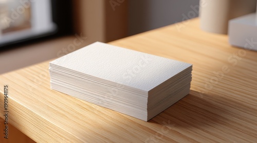 Photorealistic render of a white business card stack on a rustic wooden workspace