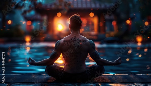 Photorealistic yoga pose, individual in a meditative lotus position in a tranquil garden, highdefinition, vivid colors, hyperdetailed textures