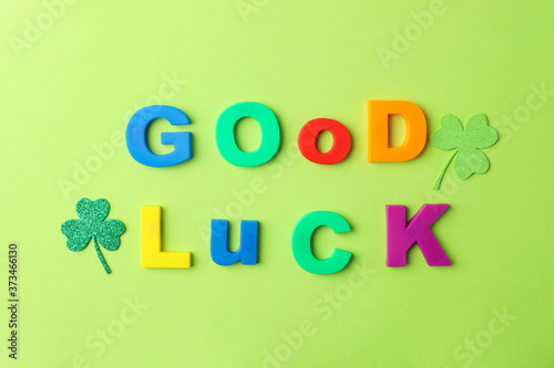 Phrase GOOD LUCK made of color letters and clover leaves on green background, flat lay