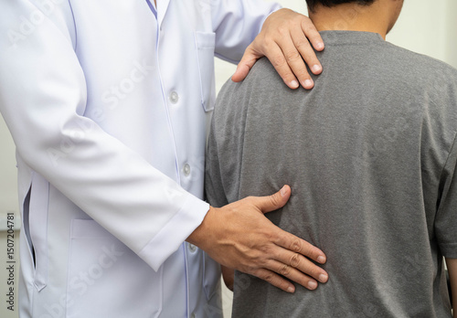 Physical therapy, Asian therapist doctor treat perform pain young man in hospital.