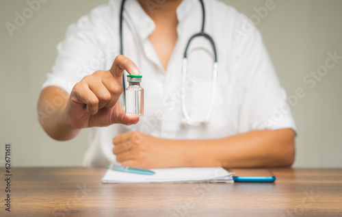 Physician holds a vaccine bottle while sitting at the table in the hospital.