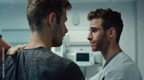 Physiotherapist examining the shoulder joint of a male patient in a modern clinic.