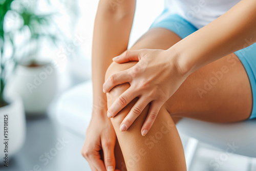 Physiotherapist giving knee therapy to a woman. Close up. White walls room.