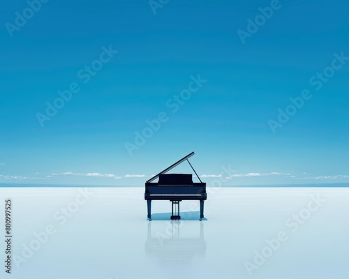 solitary, grand, piano, reflective, minimalist, surface, clear, blue, sky, invoking, quiet, balance, clarity, nature, solitude, elegant, stillness, aesthetic, open, detail, sharpened, shadow, visual, silence, landscape, background, beauty, solace, peaceful, atmosphere, harmony, design, ambience, classical, contrast, serene, shimmer, instrument, music