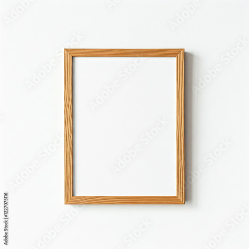 picture frame on a white wall. Minimal wooden picture poster frame mockup on white wallpaper.