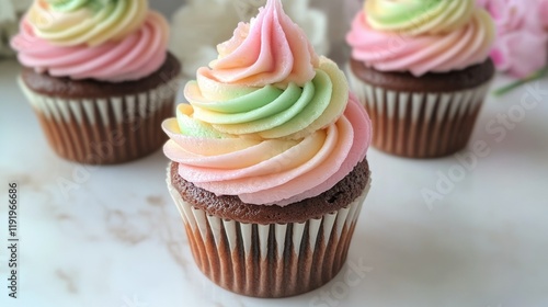 Picture-perfect pastel cupcake with elegant rainbow frosting in soft, dreamy hues of pink and green, placed on a light backdrop.