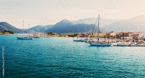 Picturesque Greece landscape with yacht during sunset. Wonderful colorful seascape. Sailing ship yachts with white sails at opened sea