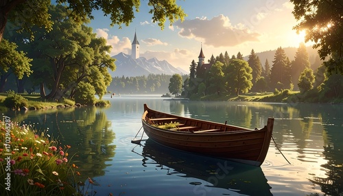 Picturesque Lake Scene with Boat, Castle and Mountains at Dawn's Light