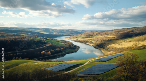 picturesque landscape featuring river, solar farms, and rolling hills under clear sky. serene environment showcases nature beauty and sustainable energy