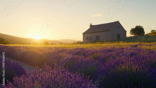 Picturesque Provence Sunrise. Rolling lavender fields, stone farmhouse & sunrise sky. Tranquil & idyllic landscape. Beautiful French countryside scene.