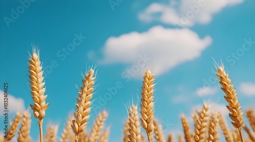 Picturesque summer landscape with a vast wheat field swaying in the gentle breeze under a clear blue sky dotted with puffy white clouds creating a serene and tranquil pastoral scene
