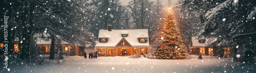 picturesque winter scene featuring snow covered town adorned with beautifully lit Christmas tree. cozy homes glow warmly amidst falling snowflakes, creating magical holiday atmosphere