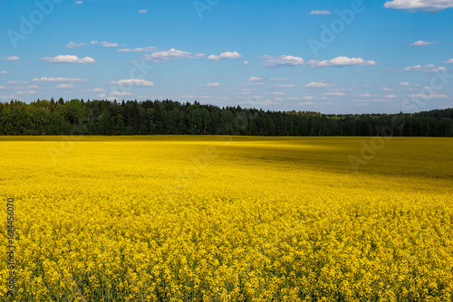 Picturesque yellow rapeseed field stretching into the distance to the forest