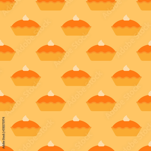 Pie seamless pattern. Pumpkin pie with whipped cream on yellow background. Traditional American Thanksgiving Give dessert. Flat design for fabric, wrapping paper, wallpaper. Vector illustration