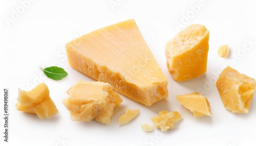 Pieces of parmesan cheese isolated on white background. Hard mature cheese Parmesan, Parmigiano in rough pieces top view, flat lay..