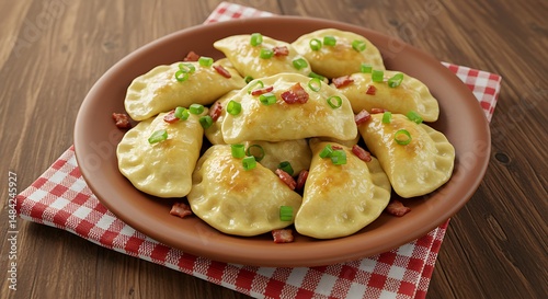 stack, bake, gold, rustic, cosy, wooden, plaid, dish, table, food, cookery, dinner, lunch, snack, filling, topping, bacon, onion, dumpling, plate, towel, fabric, meal, board, texture, vegetable, meat, closeup, horizontal, indoor, serving, eating, cooking