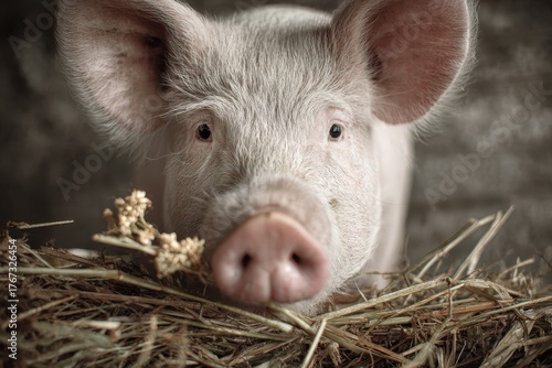 pig, portrait, barn, hay, eating, closeup, animal, farm animal, rustic, afternoon, curious, farm, nature, agriculture, snout, eye, straw, feeding, lifestyle, domestic, animal husbandry, mammal, portraiture, cute, habitat, wildlife, rural, cosy, natural light, serene, traditional, peaceful, organic, farmyard, baby pig, nose, texture, surrounding, environment, scene, countryside, swine, contentment