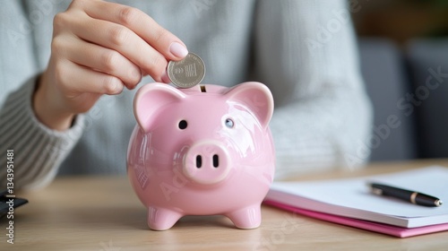 Piggy bank savings scene with woman placing coin, cozy home setting and finance tools. Piggy bank with coin held by woman, focus on personal finance and budgeting.