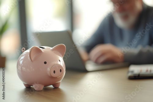 Piggy bank standing on desk with blurred retired man using laptop and doing accounting in background , ai