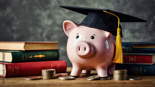 Piggy bank with black graduation cap with books and coins as symbol of education loan.