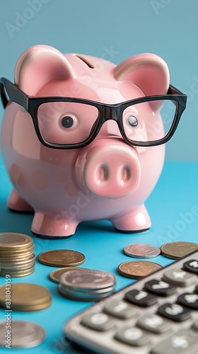 baby pig, bank, goggles, calculating machine, coin, stack, money, savings, finance, economy, budget, investment, financial, account, banking, wealth, currency, cash, deposit, removing, spend, save, manage, calculate, plan, goal, future, blue, background, closeup, sharpened, business, planning, management, literacy, education, independence, personal, retirement, advice, adviser, strategy, goal
