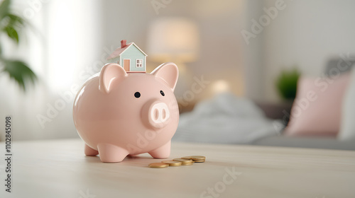 piggy bank with tiny house balanced on top symbolizes saving for home. This evokes feelings of financial security and future planning