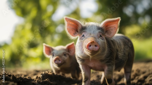 Piglets Posing in Muddy Field on a Sunny Day