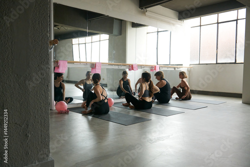 active, activity, balance, ball, balloon, body, calm, class, clothing, coach, exercise, fit, group, harmony, indoor, instructor, lifestyle, mat, physical, pilates, pose, practice, practicing, relaxation, room, slim, sport, activewear, stretch, stretching, studio, together, trainer, well-being, wellness