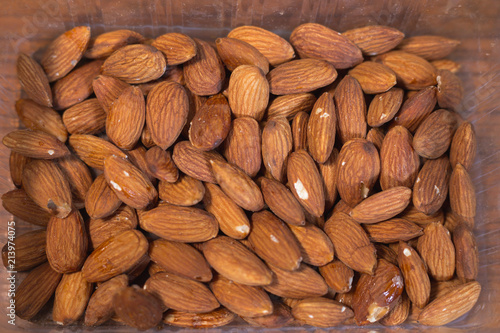 Pile of almonds in the plastic box