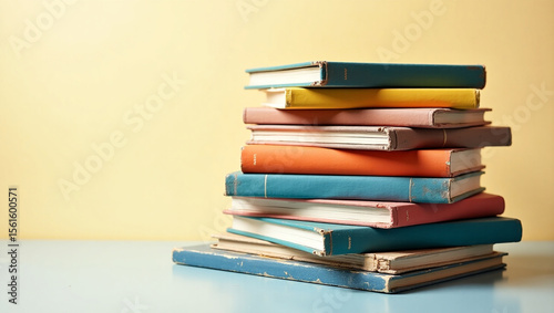Pile of colorful books on plain background. Suitable for educational, literacy or library themes. Concept of learning, knowledge and reading.