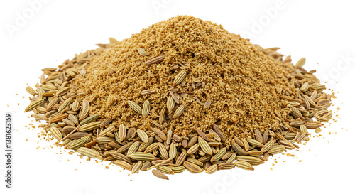 cumin, spice, powder, ground, heap, pile, ingredient, food, herb, seasoning, favor, aroma, aromatic, seed, brown, beige, closeup, macro, still life, isolated, white background, studio shot, cooking, culinary, cookery, indian, middle eastern, mexican, condiment, dry, texture, detail, organic, natural, fresh, healthy, nourishment, flavouring