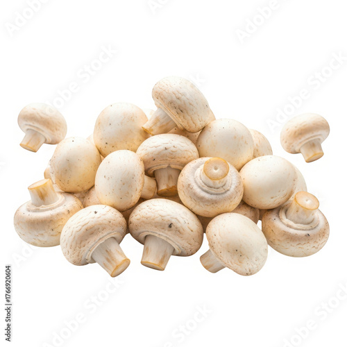 Pile of fresh white button mushrooms isolated on transparent background, raw food