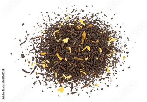 tea, leaf, black, flower, loose, pile, herb, drink, white, yellow, isolated, closeup, macro, ingredient, aromatic, beverage, natural, dry, heap, blend, herbal, infusion, texture, background, still, life, fragrant, food, plant