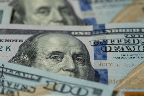 Pile of one hundred US dollar bills. United States 100 dollar bills. One hundred American dollars. United States currency.