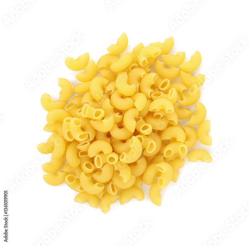 Pile of raw horns pasta isolated on white, top view