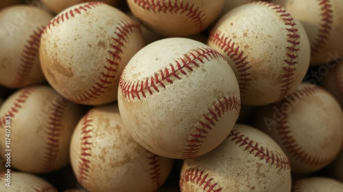 Pile of used baseballs, red stitching prominent, close-up, classic,nostalgia,macro