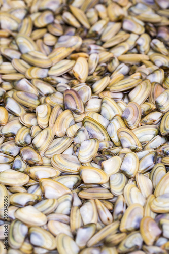 Pile of wedge clams or coquinas (Donax trunculus) for sale in indoor food market, in the Spanish city of Malaga