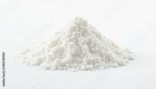 Pile of white granulated sugar on white background, closeup, cane sugar