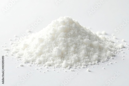 Pile of white granulated sugar on white background, sugar crystals, tabletop, sugar