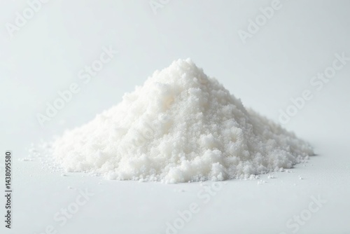 Pile of white sugar on seamless white surface, close-up, photography, heap
