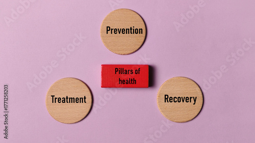 health, pillar, prevention, treatment, recovery, wellness, well-being, care, medicals, concept, abstract, diagram, model, system, service, medicine, well, healthy, life, quality, make well, therapy, insurance, management, strategy, support, aid, hospital, clinical, patient, professional, success, goal, planning, sharpened, growth, improvement, awareness, education, background, pink, purple, red, beige, topview