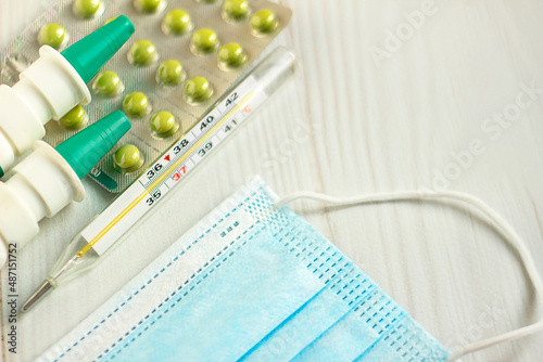 pills, a glass thermometer, a mask on a light table