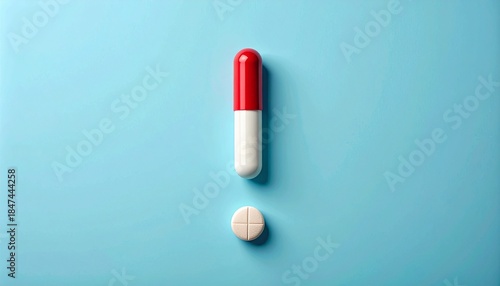 pill, capsule, medicine, health, pharmaceutical, exclamation, mark, red, beige, white, round, vertical, symbol, urgency, importance, background, blue, contrast, composition, design, visual, graphic, arrangement, creative, conceptual, pattern, center, sharpened, highlight, shape, form, object, clean, clinical, modern, stylised, abstract, medicals, scene, detail