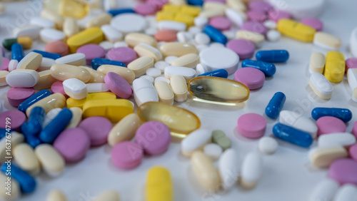 Pills, tablets, capsules, vitamins and omega3 on the white table