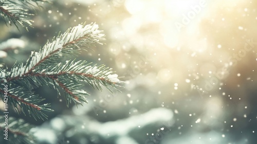 Pine branches adorned with fresh snow showcase the beauty of winter as snowflakes gently fall, adding to the peaceful ambiance of the forest
