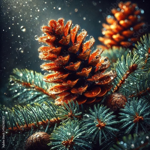 Pine branches and pine cones with rain drops