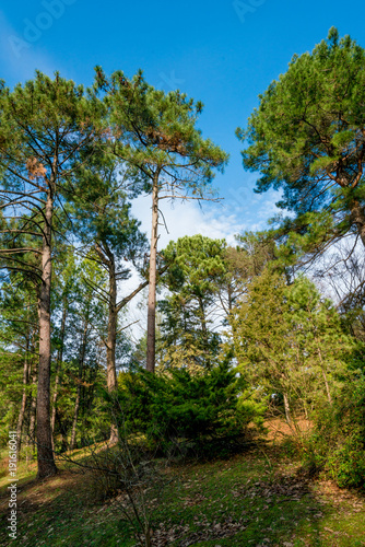 forest, pine, conifer, crown, day, floor, glade, hill, craggy, light, pine, summer, sunlight, tree, tree, treetop, trunk, warm, wood