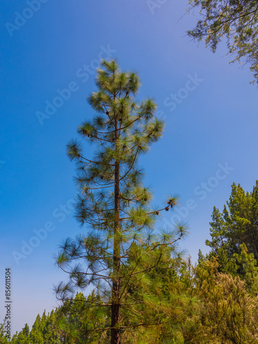 pine, green forest, lit by the golden sun, island of Tenerife against blue sky